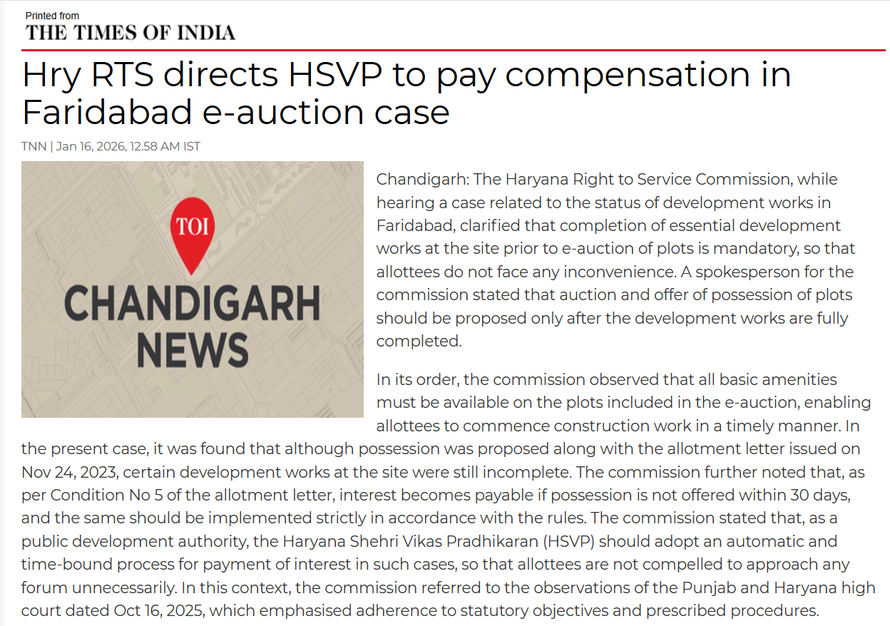 Hry RTS directs HSVP to pay compensation in Faridabad e-auction case